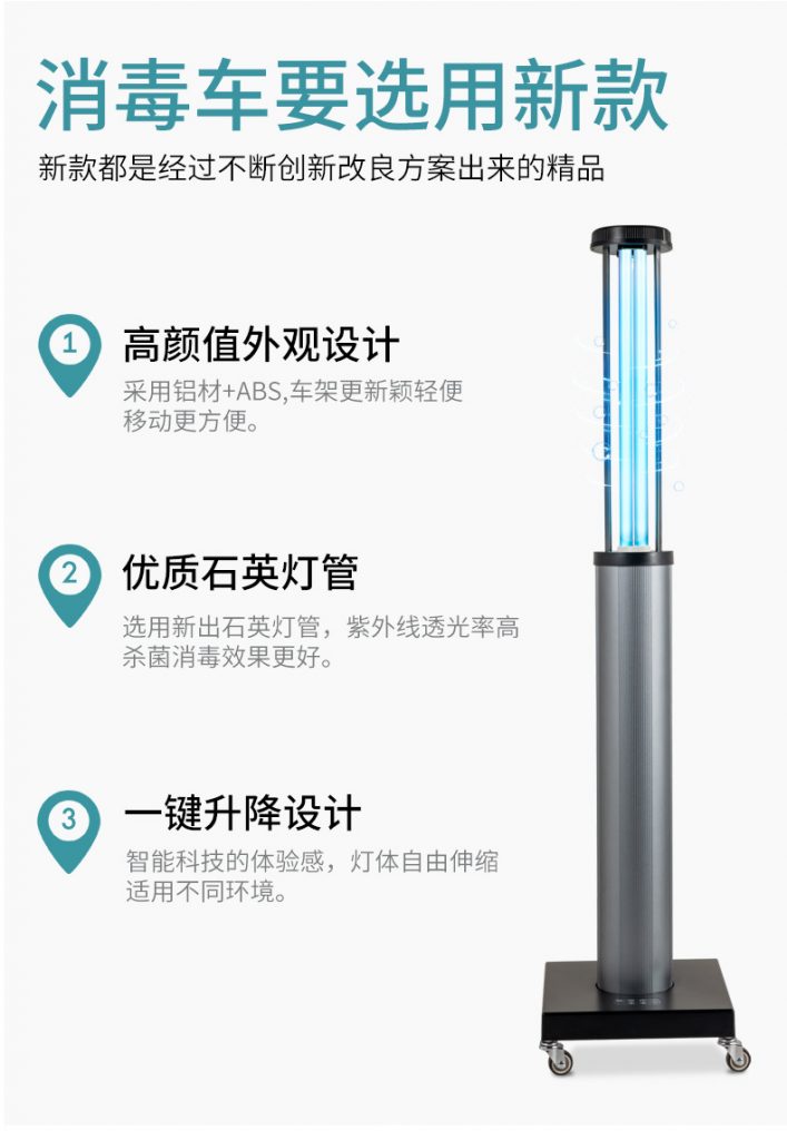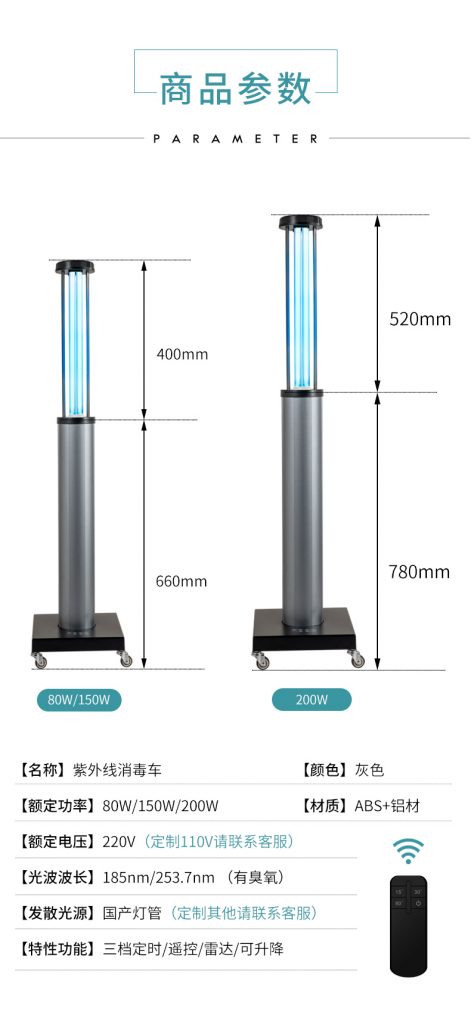 產(chǎn)品名稱:移動式升降紫外線消毒車 產(chǎn)品消毒時間可以通過遙控定時設計,帶有雷達保護功能 產(chǎn)品可以選擇有臭氧或者無臭氧 產(chǎn)品采用中性包裝。