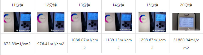 3、參考于市場(chǎng)部分硅膠機(jī)參數(shù)需求:臺(tái)線速:20 溫度范圍:60-90度,停留時(shí)間:12-15分鐘需求能量819+100mj/cm2.(我司生產(chǎn)的固汞燈30支燈管,200mm距離處20分鐘測(cè)試數(shù)據(jù)為31880.94mj/cm2)
