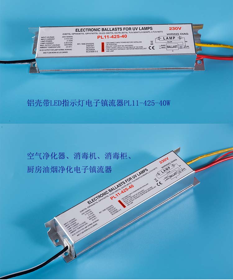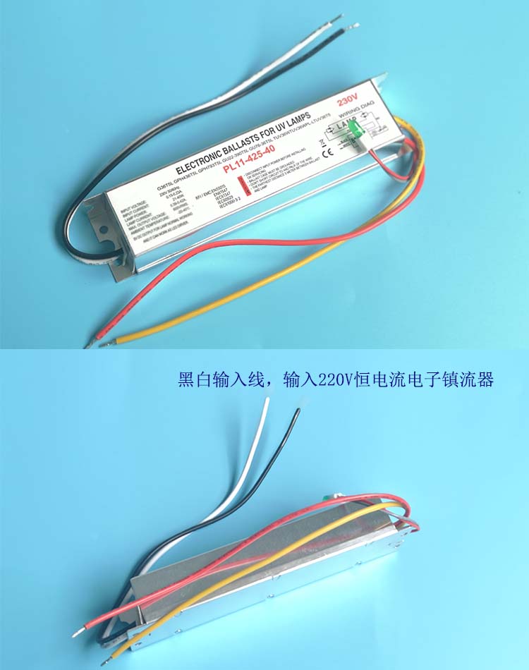 輸入電壓:220V 輸出電流:425mA 功率:20-40W 配套燈管:直管或者H管、U管 出線:2兩線輸入,四線輸出。 帶LED指示燈。 類型:IC控制電子鎮(zhèn)流器。 材料:鋁材外殼。