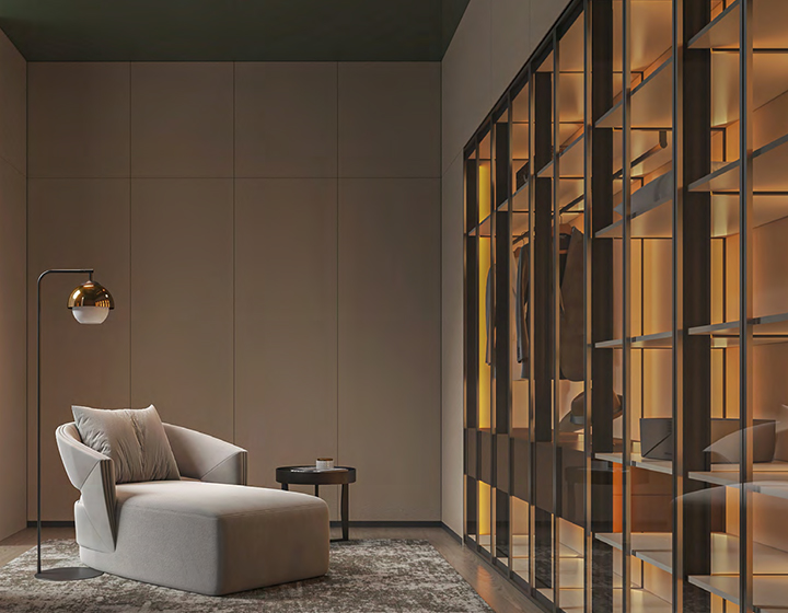 柜內(nèi)線燈位于立柱槽口向內(nèi)照射,不刺眼,且光線不會(huì)被懸掛的衣物等收納物品遮擋,方便物品的取用。